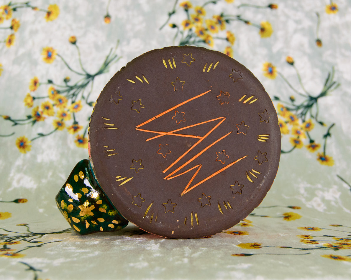 100% handmade. Wheel thrown with black stoneware and painted with underglaze. Decorated with gold luster overglaze.
